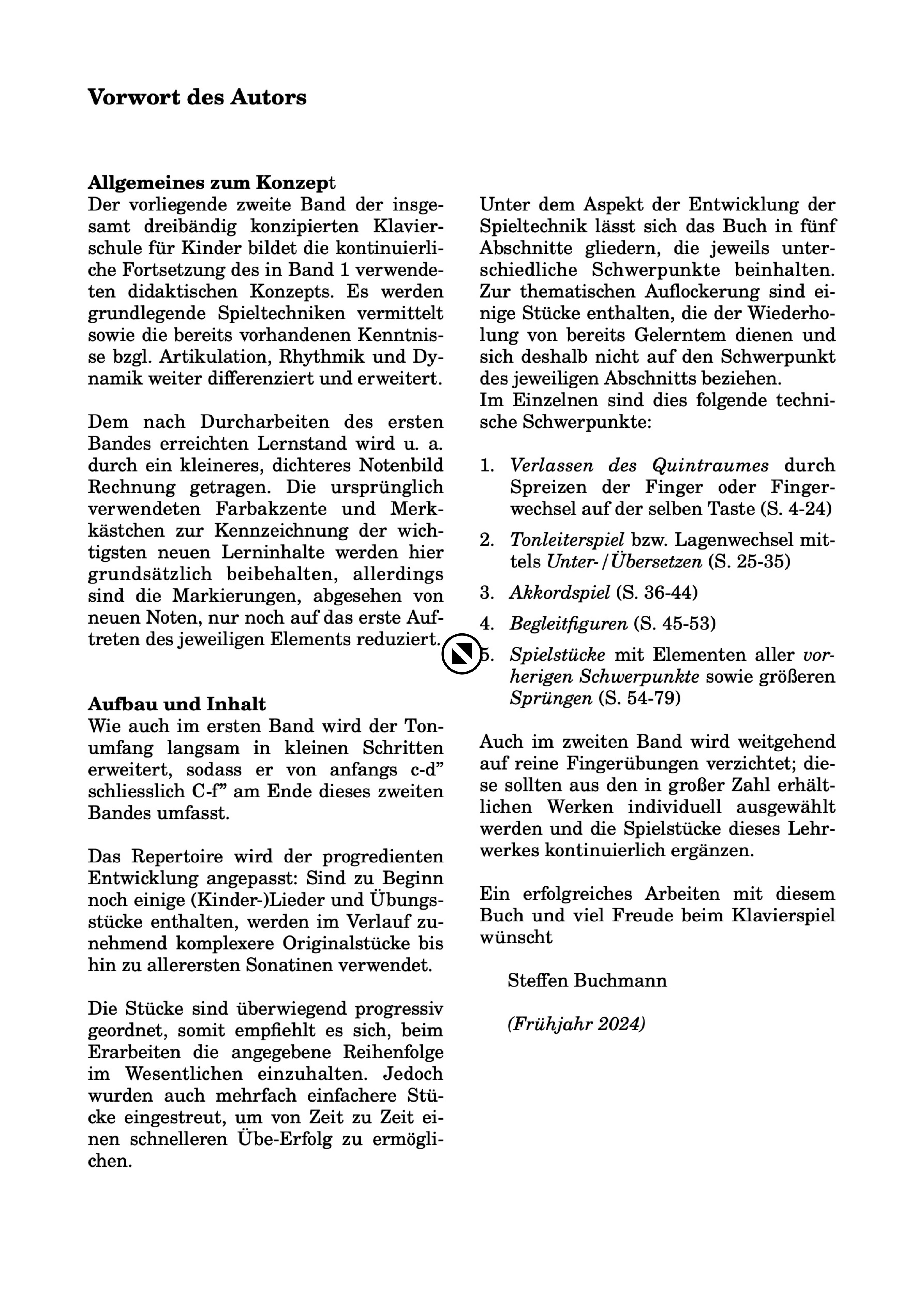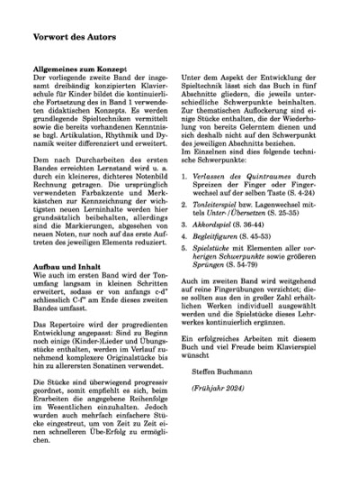 Im zweiten Band wird das Konzept und die Systematik des ersten Bandes kontinuierlich fortgesetzt - auch hier ohne zu offensichtlich schematisch präsent zu sein: Das Musizieren der eingängigen Spielstücke steht für die Lernenden im Vordergrund, die wichtigsten Begriffe sind in übersichtlichen Merkkästchen prägnant zusammengefasst. Inhaltlich stehen neben einer weiteren Differenzierung der bisher erworbenen musikalischen Kenntnisse bzgl. Artikulation, Dynamik und Rhythmik das Erlernen grundlegender Spieltechniken als Schwerpunkte im Fokus. Zudem sind mehrere vierhändige Stücke zur Auflockerung enthalten.