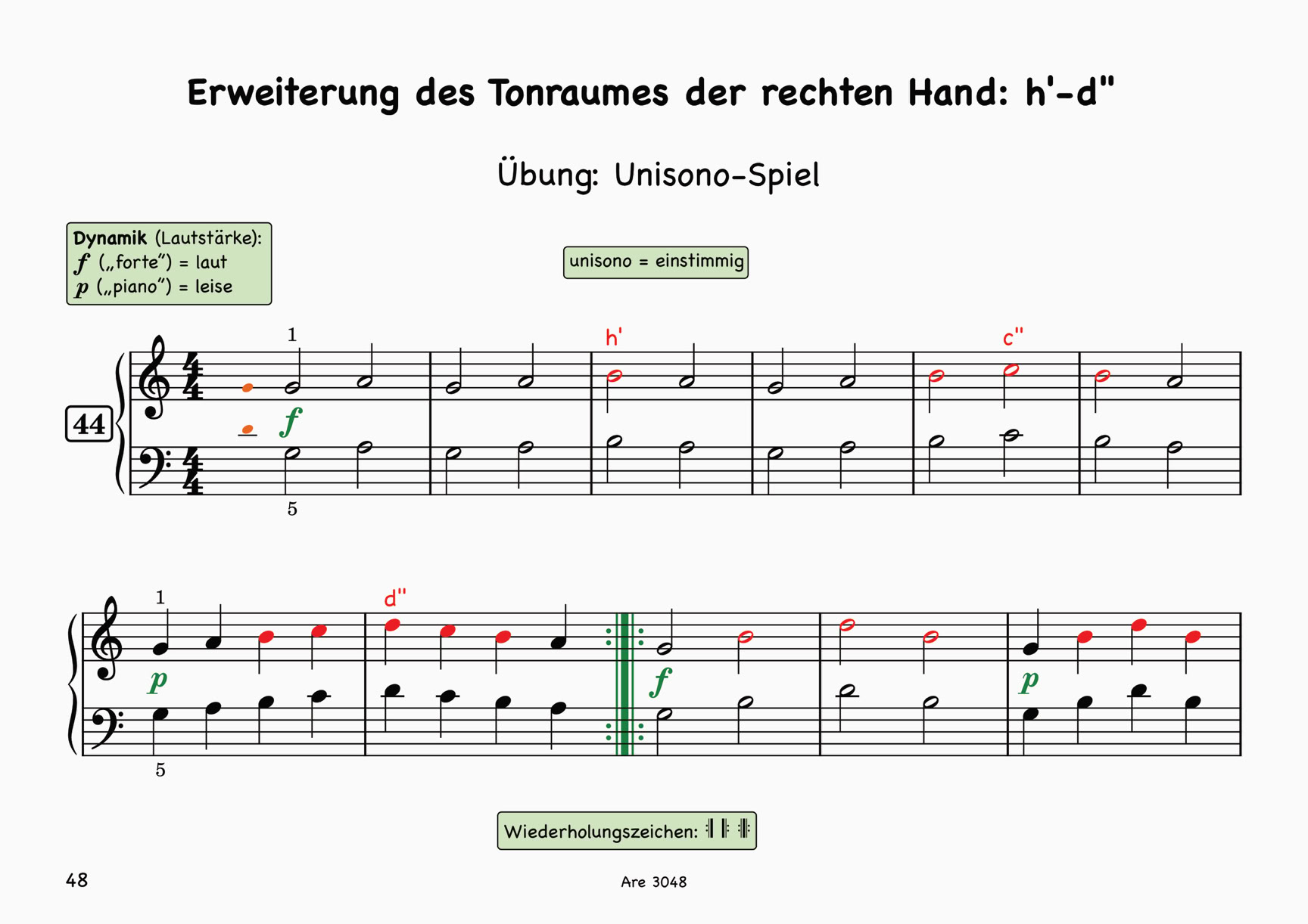 Um Überforderung zu vermeiden und die nötige Festigung der Kenntnisse beim Notenlesen zu erreichen, wird der Tonumfang nur langsam erweitert. (Am Ende des ersten Bandes beträgt er c bis d“)