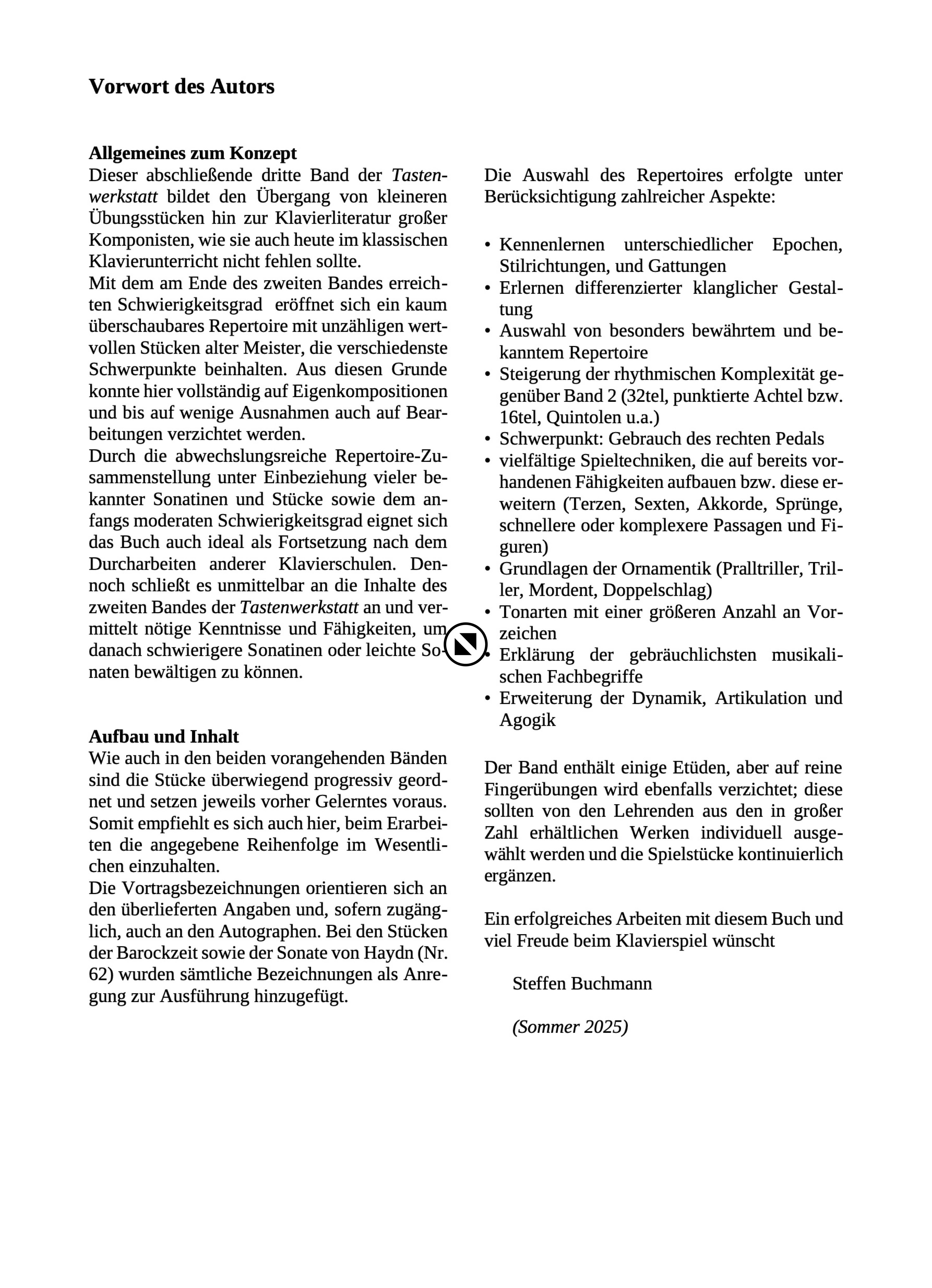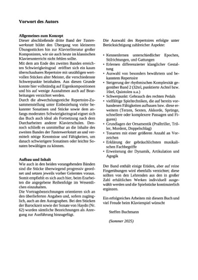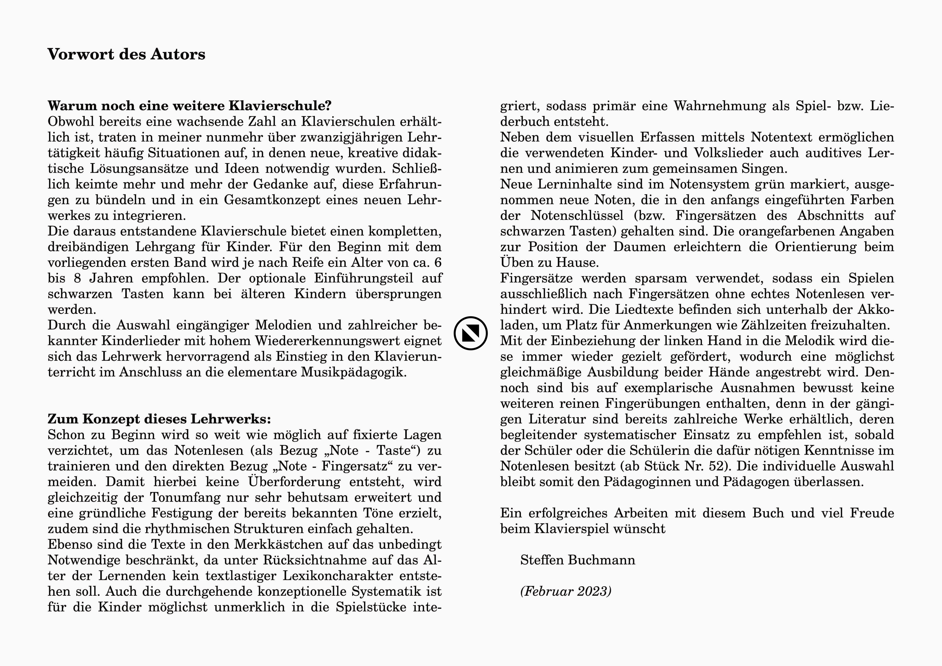 „Obwohl bereits eine wachsende Zahl an Klavierschulen erhältlich ist, traten in meiner nunmehr über zwanzigjährigen Lehrtätigkeit häufig Situationen auf, in denen neue, kreative didaktische Lösungsansätze und Ideen notwendig wurden. Schließlich keimte mehr und mehr der Gedanke auf, diese Erfahrungen zu bündeln und in ein Gesamtkonzept eines neuen Lehrwerkes zu integrieren. Die daraus entstandene Klavierschule bietet einen kompletten, dreibändigen Lehrgang für Kinder.“ Steffen Buchmann